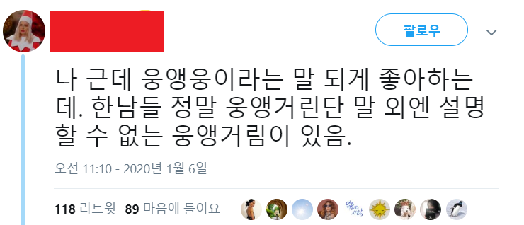 리트윗과 마음에 들어요가 각각 13K, 1200개 가량이 되는 것을 보면 알 수 있겠지만 트위터 상에서 이 웅앵웅이란 표현이 크게 인기를 끌기 시작했고,