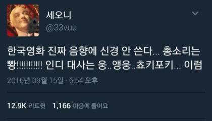 한국영화는 음향이 제대로 밸런스가 잡히지 않아 총 소리 같은 효과음은 큰데, 정작 배우들의 대사는 크지 않다는 것을