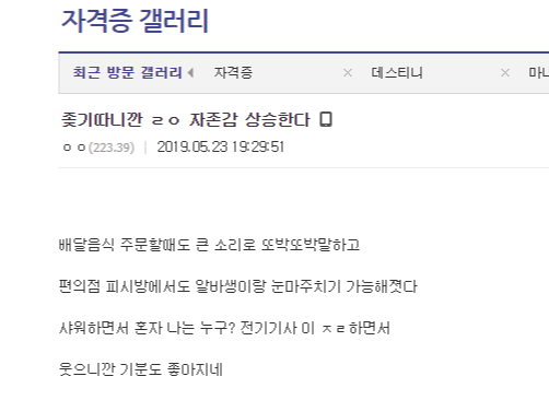 '편의점 피시방에서도 알바생이랑 눈마주치기 가능해졋다'로 디시인사이드 검색결과 가장 오래된 것은 자격증 갤러리의 '좆기따니깐 ㄹㅇ 자존감 상승한다' 라는 제목의 글이다.