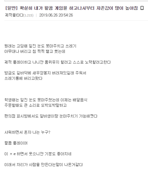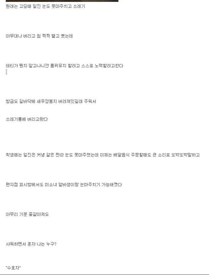 원래는 고딩때 일진 눈도 못마주치고 쓰레기 아무대나 버리고 침 찍찍 뱉고 했는데 데티가 뭔지 알고나니깐 품위유지 할려고 스스로 노력할려고한다 방금도 길바닥에 새우깡봉지 버려져있길래 주워서 쓰레기통에 버리고왔다 학생때는
